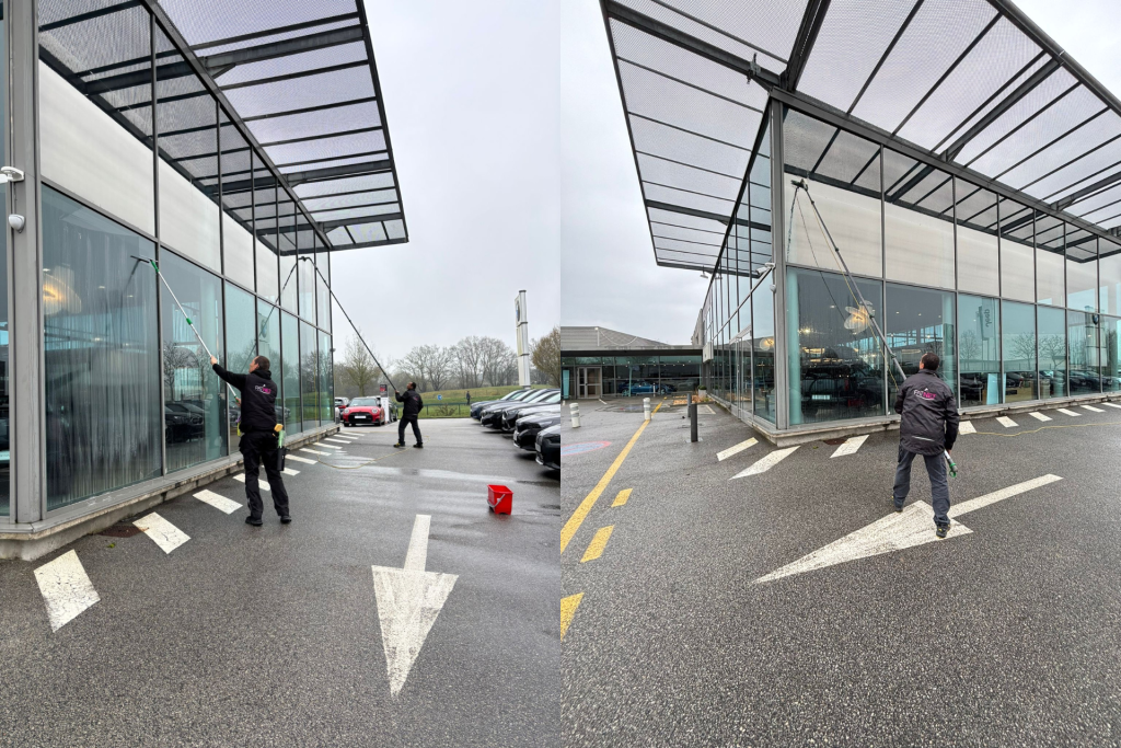 Cette méthode est particulièrement adaptée pour l’entretien des façades vitrées, bureaux, concessions automobiles ou bâtiments commerciaux disposant de grandes surfaces vitrées.